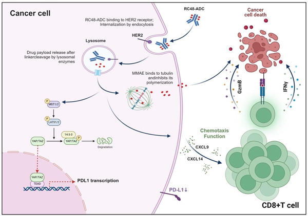 研究使用流式细胞术、免疫荧光、免疫细胞共培养、趋化实验、CUT&Tag检测、转录组学和酶联免疫吸附测定(ELISA)以及膀胱癌免疫治疗队列组织微阵列等方法,发现HER2表达与抑制性肿瘤免疫微环境和免疫治疗耐药性有关。RC48-ADC治疗可以重新激活这种HER2相关的抑制性肿瘤免疫微环境,从而增强免疫治疗效果。从机制上讲,RC48-ADC通过Hippo通路激活减少PD-L1转录来重新激活肿瘤免疫微环境。它还促进趋化因子(CCL5、CXCL9和CXCL14)的释放并招募细胞毒性T淋巴细胞。在临床前小鼠模型中,RC48-ADC与CTLA-4和PD-L1抗体协同作用。总的来说,RC48-ADC通过Hippo-TAZ通路调控PD-L1,重激活CD8 T细胞,增强免疫治疗,为膀胱癌提供一种新的联合治疗策略。
