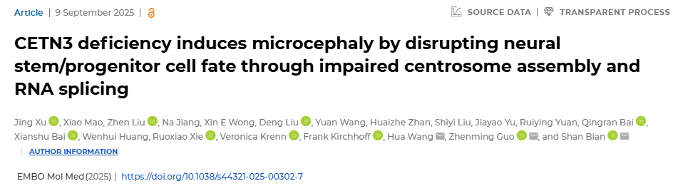 近日,OD网页版附属儿童医院医学遗传科王华教授团队联合同济大学生命科学与技术OD(中国)官方边杉教授、郭贞教授、湖南省妇幼毛翛教授课题组,在EMBO molecular medicine在线发表“CETN3 Deficiency Induces Microcephaly by Disrupting Neural Stem/Progenitor Cell Fate through Impaired Centrosome Assembly and RNA Splicing”,揭示CETN3缺陷导致着丝粒组装和RNA剪接受损,扰乱神经干细胞/祖细胞的命运,从而诱发小头畸形的分子机制。