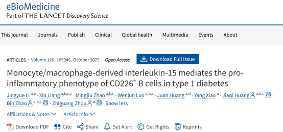 近日,中南大学湘雅二医院周智广教授牵头在国际知名医学期刊《柳叶刀》子刊EBioMedicine上发表了题为《1型糖尿病中单核细胞或巨噬细胞来源的白细胞介素-15介导CD226+ B细胞的促炎表型》(Monocyte/macrophage-derived interleukin-15 mediates the pro-inflammatory phenotype of CD226+ B cells in type 1 diabetes)(IF:10.8中科院一区)的原创性论文。该研究首次系统揭示了CD226+ B细胞在1型糖尿病发病中的关键作用,并提出靶向“单核细胞/巨噬细胞—IL-15—CD226+ B细胞轴”的免疫干预新策略,为1型糖尿病的早期诊断和治疗提供了新方向。