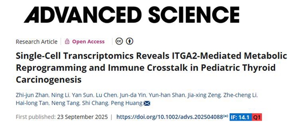近日,中南大学湘雅医院甲状腺外科常实教授团队在国际权威学术期刊《Advanced Science》(《先进科学》中科院一区,IF:14.1)以原创论著形式发表了题为“Single‐Cell Transcriptomics Reveals ITGA2‐Mediated Metabolic Reprogramming and Immune Crosstalk in Pediatric Thyroid Carcinogenesis”(ITGA2介导的代谢重编程与免疫串扰在儿童甲状腺癌中的作用),揭示了ITGA2调控儿童甲状腺乳头状侵袭性特征的新机制。