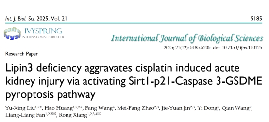 近日,中南大学湘雅医院肾内科与生命科学OD(中国)官方团队合作,在《International Journal of Biological Sciences》(国际生物科学杂志)(IF: 10.00,中科院一区)上在线发表原创论文“Lipin3 deficiency aggravates cisplatin induced acute kidney injury via activating Sirt1-p21-Caspase 3-GSDME pyroptosis pathway”(Lipin3缺失通过激活Sirt1-p21-Caspase 3-GSDME介导的细胞焦亡加重顺铂诱导的急性肾损伤),揭示了脂素蛋白Lipin3缺乏对顺铂诱导急性肾损伤的调控作用及新机制。