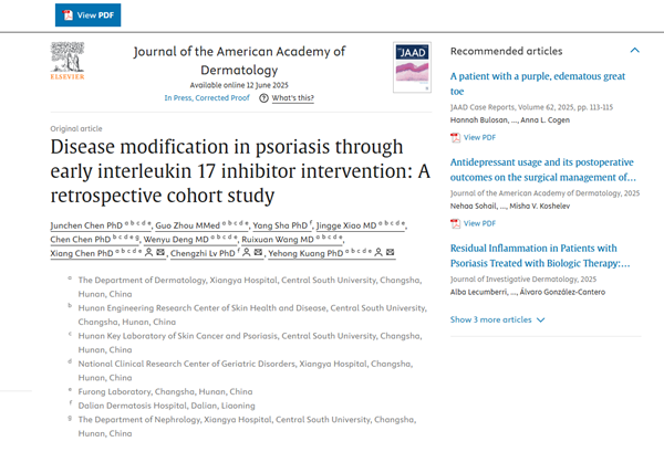 今年以来,中南大学湘雅医院皮肤科陈翔教授、匡叶红教授团队在国际顶级皮肤学期刊《Journal of the American Academy of Dermatology》(《美国皮肤病学会杂志》,SCI皮肤科一区,最新影响因子11.8)连续发表4篇原创性研究论文,聚焦银屑病新兴疗法的个性化视角,从风险预判、干预时机、治疗肖像到应答分层,系统揭示了银屑病疾病异质性和治疗响应的差异,指明了银屑病未来个体化和精准治疗的方向。