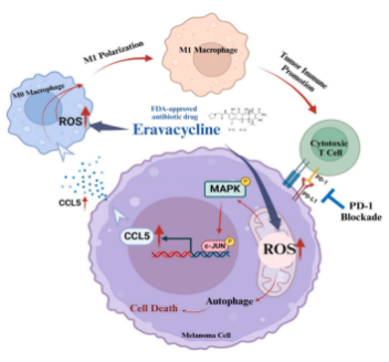 在《Biomaterials》(中科院一区Top期刊,IF=12.90)杂志上发表题为“Eravacycline improves the efffcacy of anti-PD1 immunotherapy via AP1/ CCL5 mediated M1 macrophage polarization in melanoma”(Eravacycline通过AP1/ CCL5介导的M1巨噬细胞极化增强黑素瘤PD-1免疫治疗疗效)的原创性论著。