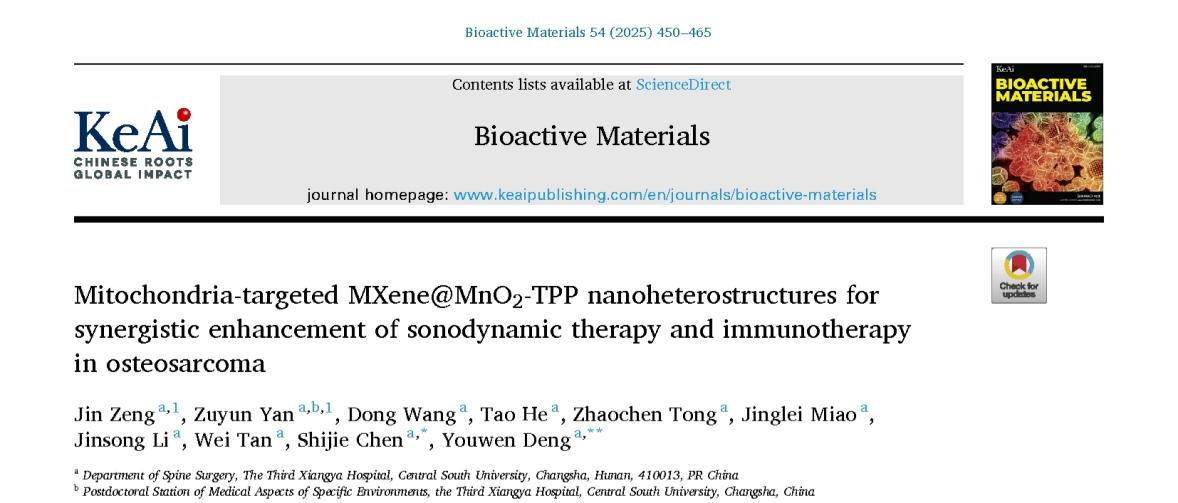 近日,中南大学湘雅三医院脊柱外科邓幼文教授、陈世杰教授团队在国际权威学术期刊《生物活性材料》(Bioactive Materials,中科院一区,Top期刊,影响因子20.3)发表题为 “线粒体靶向MnO2@Mxene-TPP纳米异质结协同增强骨肉瘤声动力疗法/免疫疗法(Mitochondria-targeted MXene@MnO₂-TPP nanoheterostructures for synergistic enhancement of sonodynamic therapy and immunotherapy in osteosarcoma)” 的原创研究论文。