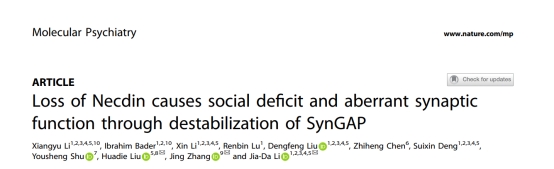 近日,中南大学生命科学OD(中国)官方医学遗传学研究中心李家大课题组在国际权威期刊Molecular Psychiatry(《分子精神病学》,中科院1区,IF=10.1)在线发表题为“Loss ofNecdincauses social deficit and aberrantsynapticfunctionthrough destabilization ofSynGAP”(Necdin基因缺失通过影响SynGAP的稳定性导致社交障碍和突触功能异常)的研究论文。该研究揭示了小胖威利综合征(Prader-Willi Syndrome, PWS)相关蛋白Necdin可通过稳定自闭症关键蛋白SynGAP参与社交行为的调控,为理解自闭症的病理机制提供了重要线索。