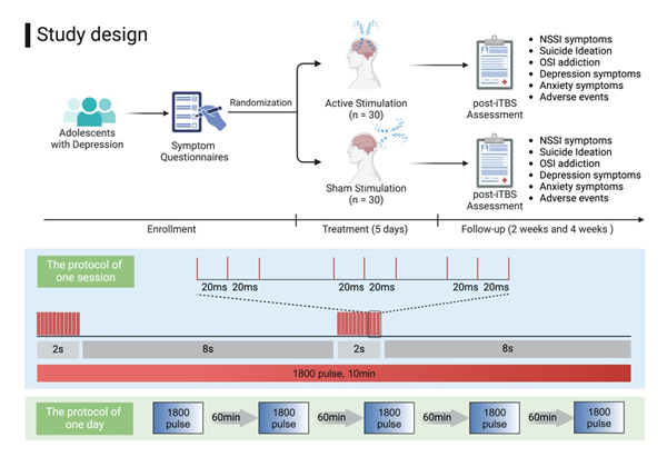 研究采用随机、双盲、伪刺激对照设计,共纳入60名12-18岁伴有NSSI行为的青少年抑郁障碍患者,随机分为真刺激组和伪刺激组,接受了连续5天、每天5次、每次1800脉冲募铀傺映TBS治疗。主要结局指标为干预结束后4周末青少年修订版蓄意自伤量表(Deliberate Self-Harm Inventory-Adolescent Revised, DSHI-AR)量表评分的变化。次要结局指标包括青少年修订版蓄意自伤意念量表(DSHI-AR ideation)、渥太华自伤量表成瘾子量表(OSI-addiction)、汉密尔顿抑郁量表17项(HAM-D₁₇)、汉密尔顿焦虑量表(HAMA)、贝克自杀意念量表(BSI)、匹兹堡睡眠质量指数(PSQI)及Barratt冲动量表11项(BIS-11)评分的变化。
