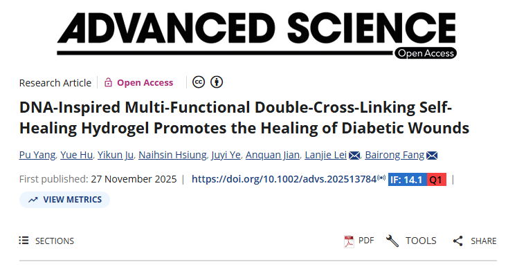 近日,中南大学湘雅二医院整形美容与烧伤外科团队在材料-医学交叉领域国际顶级期刊《Advanced Science》(中科院一区Top,IF=14.1)在线发表题为“DNA-Inspired Multi-Functional Double-Cross-Linking Self-Healing Hydrogel Promotes the Healing of Diabetic Wounds”的研究论文。该研究首创“碱基配对+动态共价”双交联策略,构建可注射、自修复、长效缓释的ATG@ExoCur水凝胶,实现糖尿病慢性创面“抗菌-抗氧化-促血管-免疫调节”四效协同,为临床转化提供全新范式。我院整形美容与烧伤外科方柏荣教授为共同通讯作者。