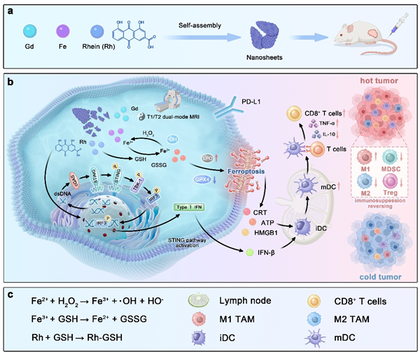 免疫抑制性肿瘤微环境(ITME)会促进肿瘤免疫逃逸,并导致对检查点阻断疗法产生耐药性。如何通过创新策略重新激活免疫监视,最终将"冷"肿瘤转化为"热"肿瘤,仍然是癌症免疫治疗领域面临的关键挑战。激活干扰素基因刺激因子信号(STING)通路为重塑ITME提供了一种前景广阔的策略,但现有的STING激动剂面临着快速降解和生物利用度差等局限性。基于此,团队通过Gd3+、Fe3+与天然化合物大黄酸的配位自组装,开发了一种多功能双金属-大黄酸纳米片(FGR NSs)。该FGR NSs能同时激活STING信号通路并诱导铁死亡。天然产物大黄酸会引发DNA双链断裂,从而促进STING激活,并将干扰素-b(IFN-b)的分泌量提高3.06倍。Fe3⁺通过芬顿反应催化内源性过氧化氢转化为剧毒的羟基自由基,并消耗谷胱甘肽(GSH),从而促进活性氧(ROS)的生成并驱动铁死亡。这些机制共同启动了先天性与适应性免疫应答,并释放出大量的损伤相关分子模式(DAMPs,包括CRT、ATP、HMGB1和IFN-β),进而促进树突状细胞成熟、CD8⁺T细胞启动以及巨噬细胞从M2型向M1型的复极化。此外,它还抑制了包括调节性T细胞(Tregs)和髓源性抑制细胞(MDSCs)在内的免疫抑制性细胞的浸润。