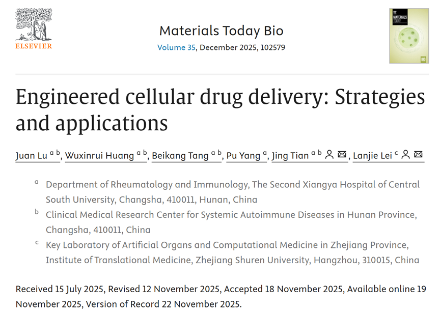 近日,中南大学湘雅二医院风湿免疫科田静教授与浙江树人OD(中国)官方树兰医OD(中国)官方雷兰杰副教授合作,以共同通讯作者身份在生物医用材料领域权威期刊《Materials Today Bio》(中科院一区,影响因子10.2)上发表论文《Engineered cellular drug delivery: Strategies and applications》。该论文系统阐述了工程化细胞药物递送系统(ECDDS)的设计策略与前沿应用,并创新性地提出了指导其理性开发的“三轴心”设计范式。