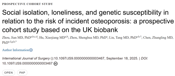 在《国际外科学杂志》(International Journal of Surgery)(IF=10.4)上,发表了题为“Social isolation, loneliness, and genetic susceptibility in relation to the risk of incident osteoporosis: a prospective cohort study based on the UK biobank”的原创性论著。研究首次在大规模人群中证实,社交隔离与孤独感不仅影响心理健康,也可独立增加骨代谢疾病风险,风险分别上升约18%和25%,在遗传易感个体中效应更明显。研究提示,社交隔离与孤独可能通过激活慢性应激反应、升高皮质醇水平、诱发持续性低度炎症,干扰骨代谢平衡,并对心血管代谢健康造成潜在影响。