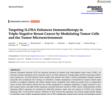 近日,中南大学湘雅二医院乳腺外科易文君教授团队在《先进科学》(Advanced Science,IF=14.1,中科院一区TOP期刊)发表题为 “靶向 IL27RA 通过调控肿瘤细胞及肿瘤微环境增强三阴性乳腺癌免疫治疗效果”(Targeting IL27RA Enhances Immunotherapy in Triple-Negative Breast Cancer by Modulating Tumor Cells and the Tumor Microenvironment)的原创性研究论文。
