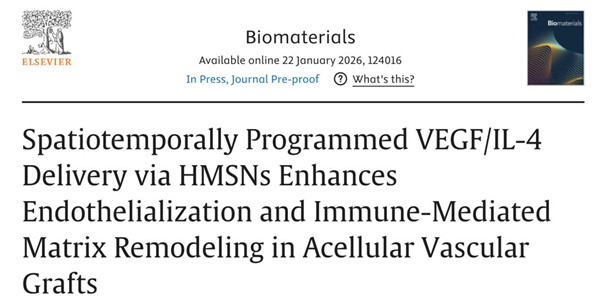 近日,中南大学湘雅二医院心血管外科、心血管用生物工程材料湖南省工程实验室吴忠仕教授团队在国际生物材料领域顶级期刊《生物材料》(Biomaterials)(IF=12.9)发表原创性研究论文《基于中空介孔二氧化硅纳米粒的VEGF/IL-4时空程序化控释系统增强脱细胞血管移植物内皮化及免疫介导的基质重塑》(Spatiotemporally Programmed VEGF/IL-4 Delivery via HMSNs Enhances Endothelialization and Immune-Mediated Matrix Remodeling in Acellular Vascular Grafts)。