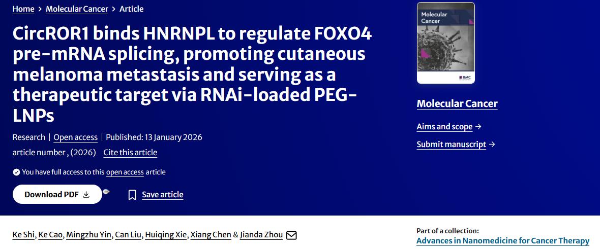 近日,中南大学湘雅三医院烧伤整形科周建大团队在国际肿瘤领域权威期刊《Molecular Cancer》(分子癌症,中科院一区,IF=33.9)发表原创性论著“CircROR1 binds HNRNPL to regulate FOXO4 pre-mRNA splicing, promoting cutaneous melanoma metastasis and serving as a therapeutic target via RNAi-loaded PEG-LNPs”(环状RNA ROR1通过与HNRNPL结合调控FOXO4前体mRNA剪接,进而促进皮肤黑色素瘤转移,并可通过负载RNAi的PEG-LNPs作为治疗靶点)。该研究在国际上首次揭示了CircROR1通过结合剪接因子HNRNPL重塑FOXO4前体mRNA可变剪接,从而驱动皮肤黑色素瘤(cutaneous melanoma, CM)转移进展的关键分子机制,并进一步验证靶向circROR1的RNA干扰(RNAi)纳米药物的策略,为转移性黑色素瘤的精准治疗提供了新的潜在靶点和转化路径。