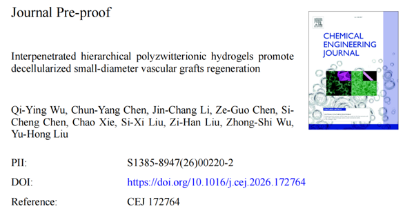 近日,湘雅二医院心血管外科、心血管用生物工程材料湖南省工程实验室吴忠仕教授团队,在国际化学工程领域期刊《化学工程杂志》(Chemical Engineering Journal,中科院一区,IF: 13.2)上发表了题为《互穿层次化两性离子水凝胶促进去细胞化小口径血管移植物再生》(Interpenetrated hierarchical polyzwitterionic hydrogels promote decellularized small-diameter vascular grafts regeneration)的原创性研究论文。该研究创新性地将仿生两性离子水凝胶与去细胞牛肋间动脉相结合,成功开发出一种具备修复功能的新型小口径血管移植物。该移植物在植入大鼠体内6周后通畅率达到100%,且成功实现了血管内皮与平滑肌的再生。