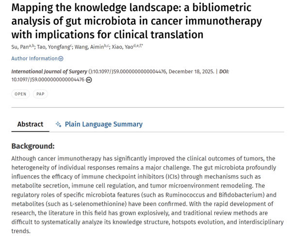 近日,湘雅医院护理团队在国际外科学顶尖期刊《International Journal of Surgery》(国际外科学杂志)(IF=10.3,JCR Q1区)发表题为《Mapping the Knowledge Landscape: A Bibliometric Analysis of Gut Microbiota in Cancer Immunotherapy with Implications for Clinical Translation》(绘制知识图谱:癌症免疫治疗中肠道微生物群的文献计量分析及其临床转化意义)的原创性研究论文。急诊科副主任护师苏盼为论文独立第一作者。