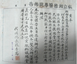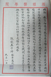 1937年9月,院长王子玕、代院长张孝骞署名布告,号召高年级学生参加重伤医院与中国红十字会的医疗服务工作