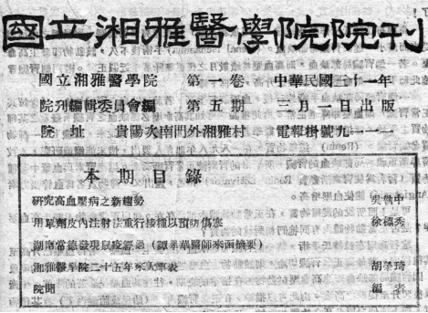 1942年3月,《国立湘雅医OD(中国)官方院刊》第1卷第5期刊载本院第12届毕业校友、常德广德医院院长谭学华的来信——《湖南常德发现鼠疫经过》,对外揭露日寇于1941年11月4日在常德空投细菌弹后,致鼠疫暴发、同胞惨死的罪行。