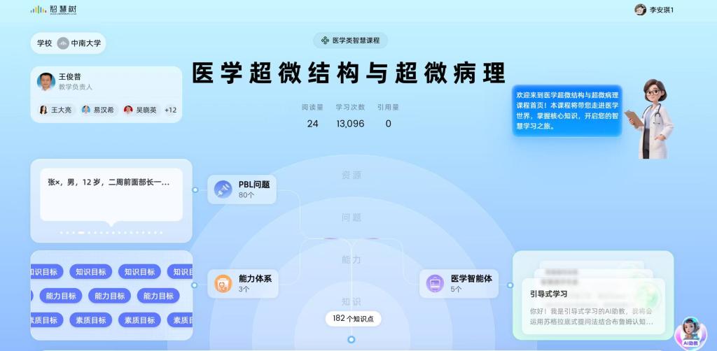 在显微镜下洞察秋毫,于柳叶刀前探解谜题。当我们向彭老请教,有何话语可赠予湘雅学子时,他郑重说道:“机遇,永远眷顾有准备的人。”承继湘雅这一宝贵传统以及彭老教授的嘱托,基于几代人打下的良好基础,在中南大学首轮智慧课程建设浪潮中,湘雅病理学学科电镜超微病理亚学科抓住机遇,将《医学超微结构与超微病理》课程与信息技术深度融合,实现了从传统教学向智慧课程的跨越式发展。课程构建了“知识—问题—能力”三维图谱体系,通过智能驱动和资源重构,支持学生开展自主、交互和个性化学习。智慧树平台及AI助教等技术工具为教学提供强大支持,实现学情分析、资源推送和自动答疑等功能,帮助教师聚焦教学设计,促进学生科研素养与临床思维能力的整体提升。