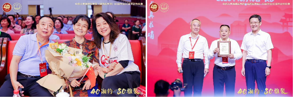 这份感恩之情,不仅化作鲜花与掌声,也凝结为对母校的切实回馈。随后举行的捐赠仪式上,1980级校友集体向母校捐赠了56件承载集体记忆的珍贵物品,包括湘雅典藏图书、教材、班级荣誉奖状、老照片、纪念章与奖牌等,每一件都是时光的印记,也是一代人对来路的深情回望。黎志宏副校长代表学校上台授予1980级校友捐赠纪念牌,共同见证这场跨越四十载的精神传承。