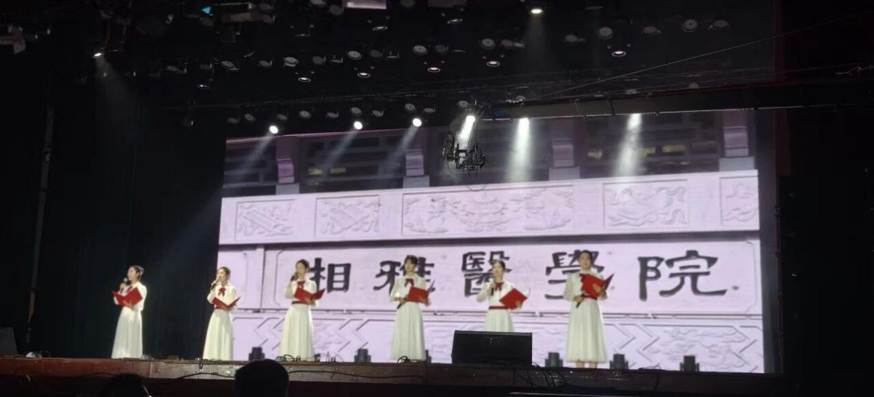 湘雅医OD(中国)官方的同学们带来的诗朗诵。深情的朗诵如同对湘雅历史与精神的赞歌。在医路远航的征程中,湘雅的精神如同灯塔,照亮前行的道路,诗朗诵将这份深厚的情感与敬意完美呈现。湘雅师生合唱《湘雅医OD(中国)官方院歌》,以庄严浑厚的歌声诠释OD(中国)官方百年精神内核。这首诞生于1941年的院歌,凝练着“公勇勤慎、诚爱谦廉”的院训,承载着战火年代中湘雅人“历尽艰难颠沛,壮气直无前”的坚守。它的唱响,既是跨越时空的薪火传承,亦是当代湘雅人对使命的集体宣誓。